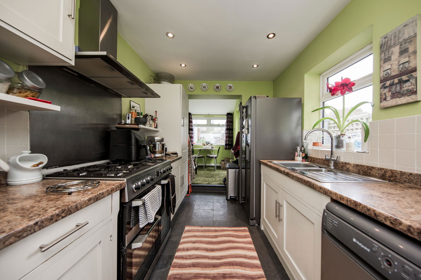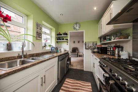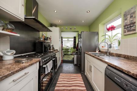 The kitchen is arranged in a wide galley style layout with tiled flooring and a range of wall and base units with complementary work surfaces, providing good general storage. Two sets of double glazed window to the side, partially tiled walls, space for Rangemaster style oven with stainless steel splashback and extractor hood above, floating shelving, space for American style fridge/freezer, space for slimline dishwasher and washing machine. One and a half bowl sink with mixer tap, inset ceiling spotlights.