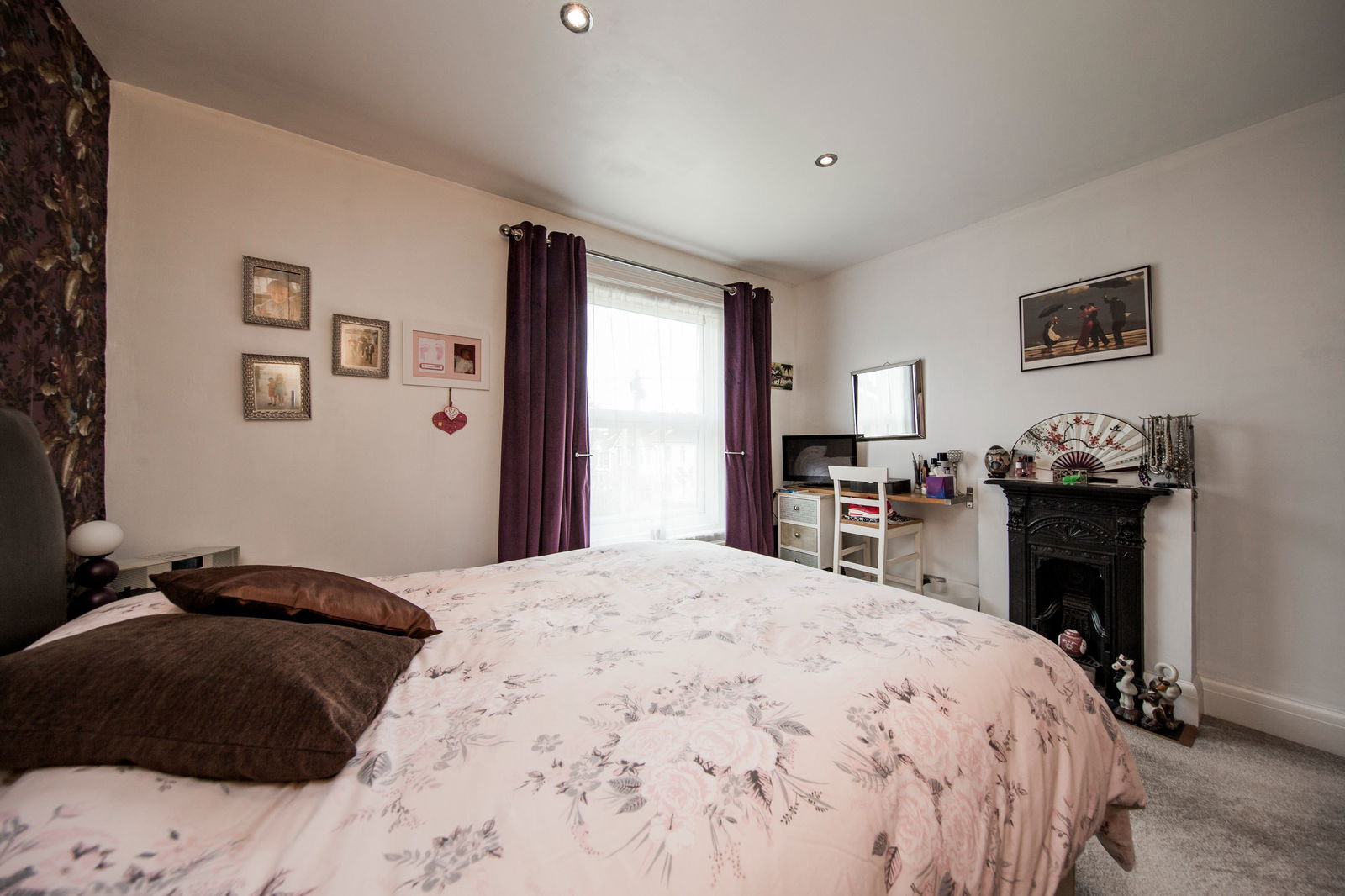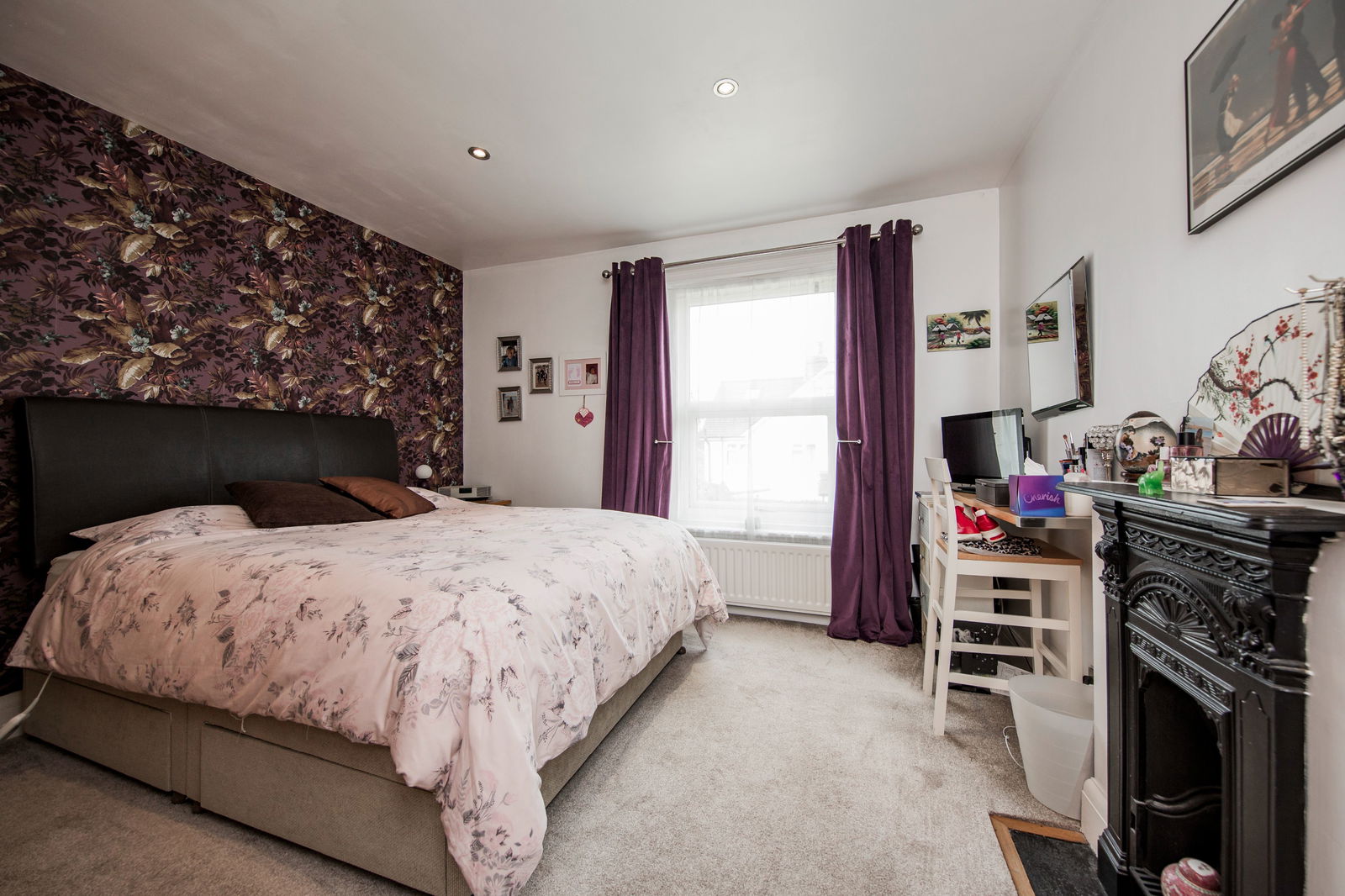 A spacious main bedroom, double glazed window to front, space for large double bed and additional bedroom furniture, feature aesthetic cast iron fire place with stone hearth, inset ceiling spotlights, carpeted, radiator.