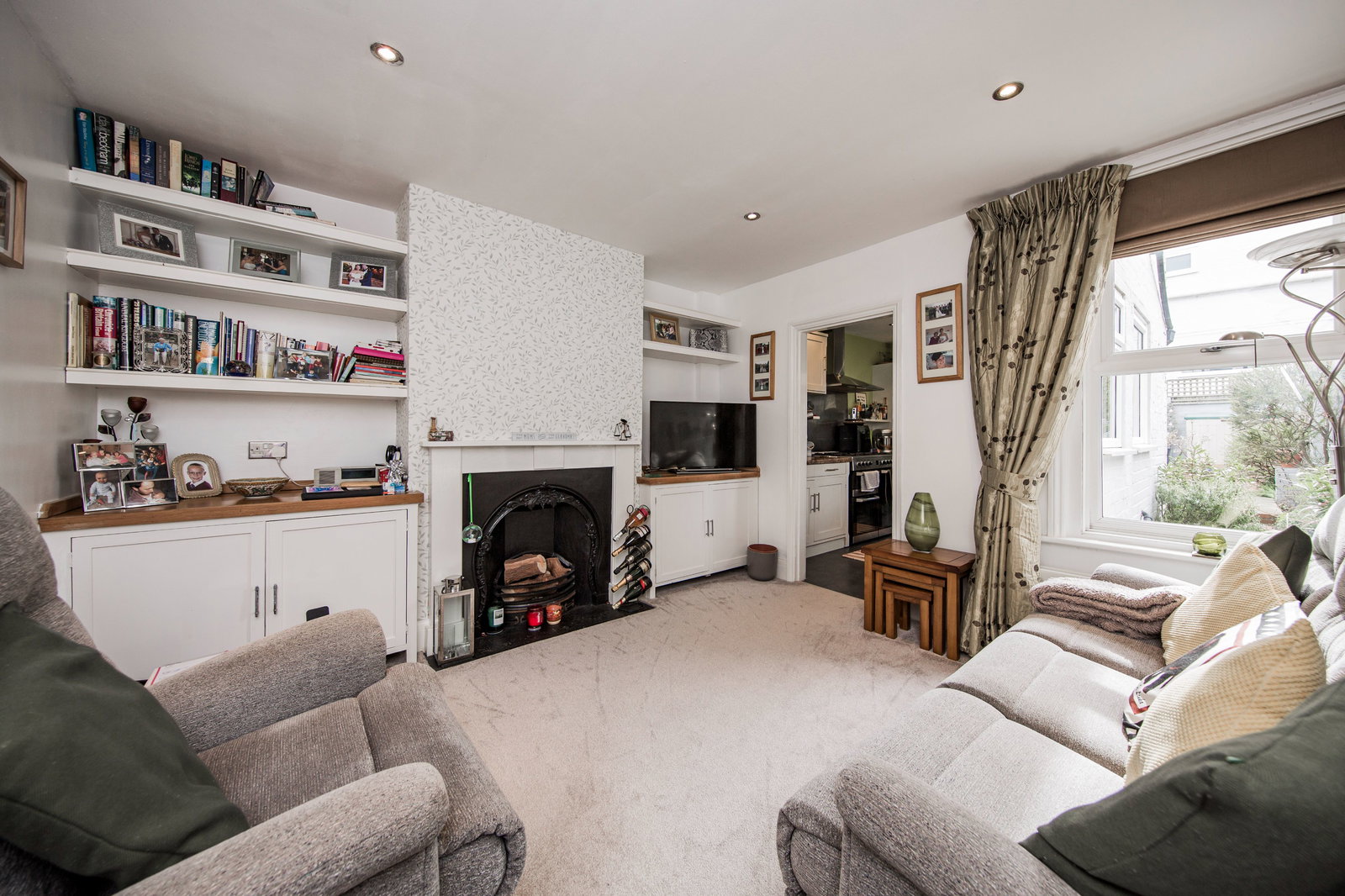 A good sized sitting room providing ample space for lounge furniture and entertaining. Double glazed window to rear with fitted Roman blind, feature aesthetic cast iron fireplace with wooden mantle and stone hearth, fitted cupboards to either side of the chimney breast with polished wooden shelving. Additional shelving and space for a television, inset ceiling spotlights, carpeted, radiator.