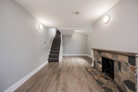 Wood laminate flooring, two double glazed windows to side, two radiators, iron fireplace with stone hearth and mantle, heating thermostat, and under-stairs storage area.