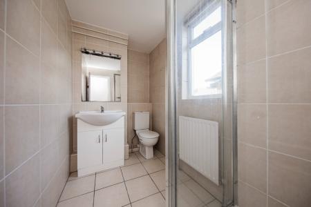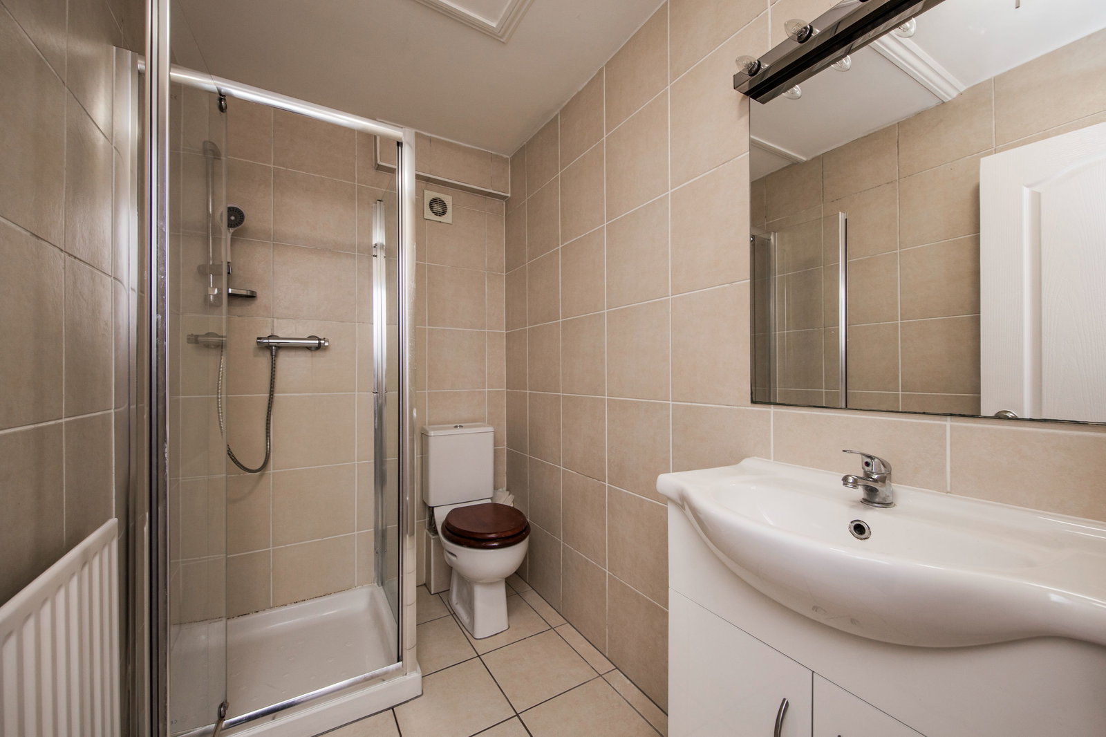 Tiled flooring and walls, shower unit with wall-mounted taps, vanity unit with mounted sink, illuminated mirror, low level WC, radiator.