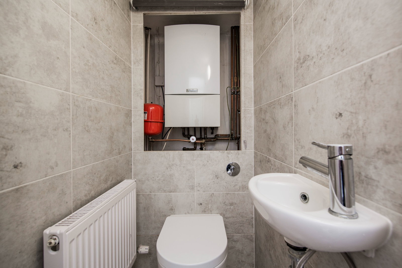 Tiled flooring and walls, wall-mounted sink with mixer tap, low level WC, radiator, and boiler.