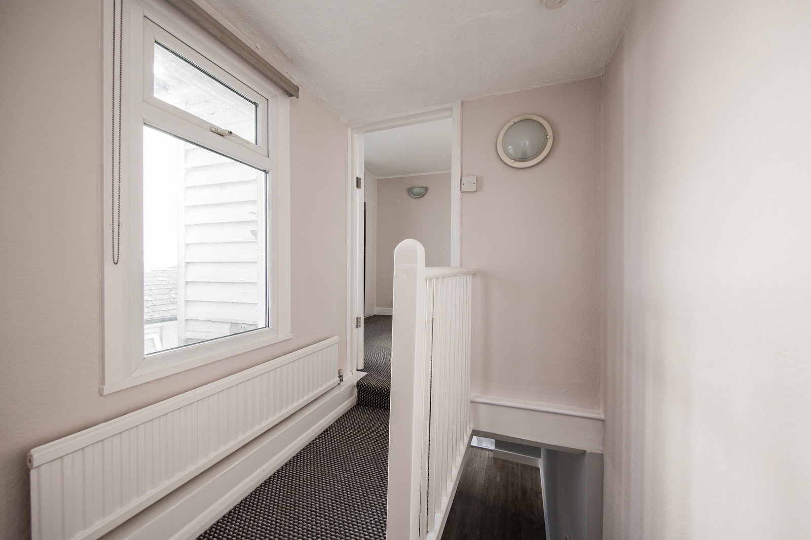 Split-level landing, carpeted, with double glazed windows to side and radiator.