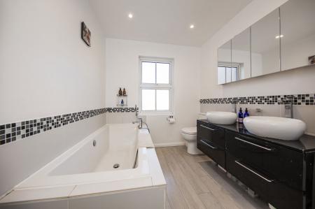 BATHROOM: Tall frosted window, large bath with mixer taps and shower attachment, walk in shower with rain head and separate attachment, WC, twin basins with storage below, tall heated towel rail, wide mirrored cabinets, extractor fan, wood effect laminate flooring.