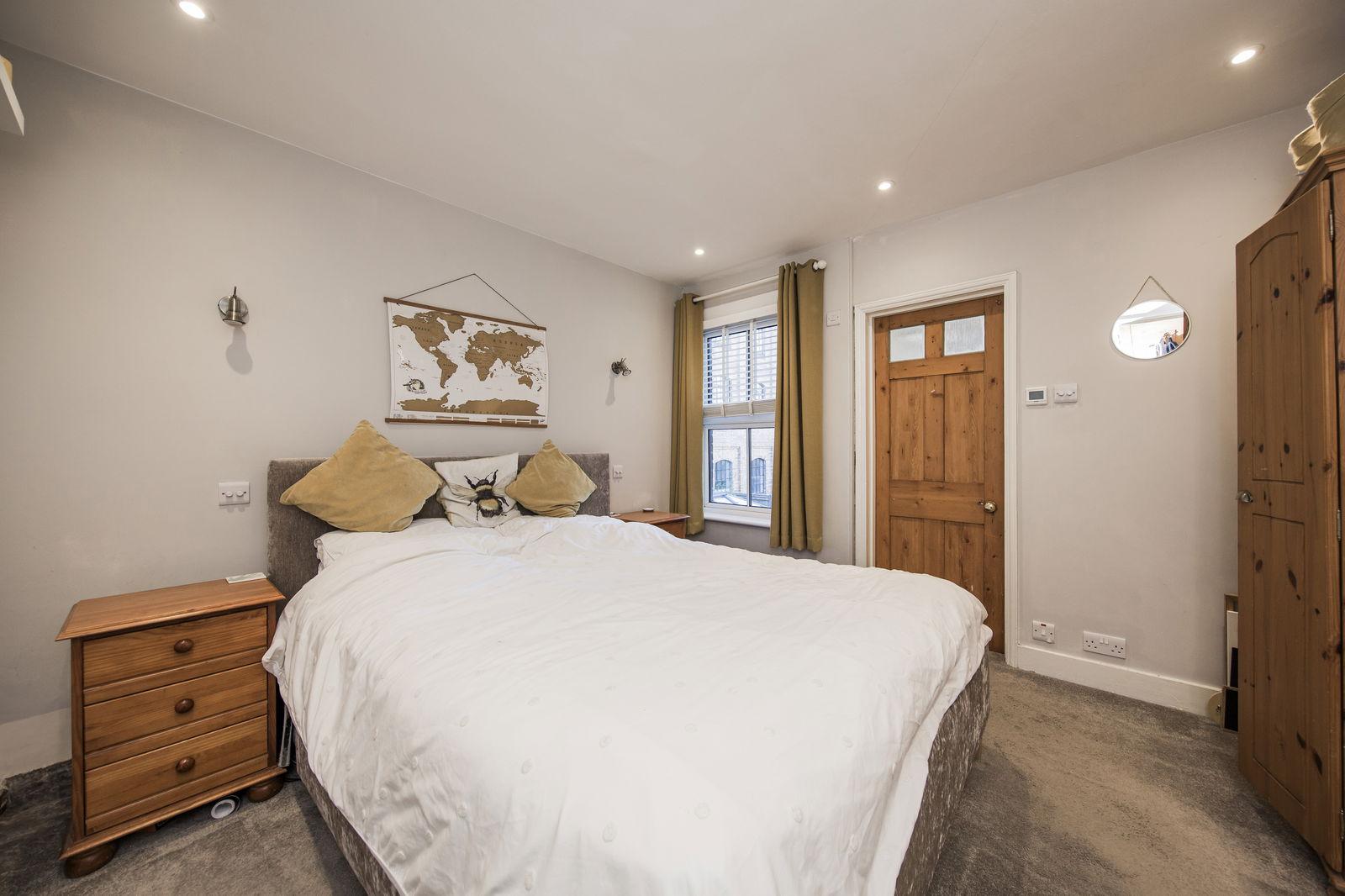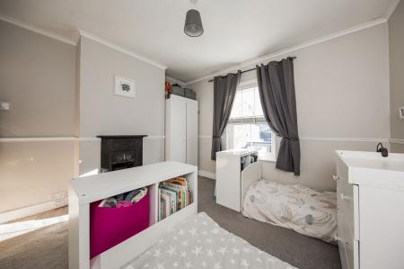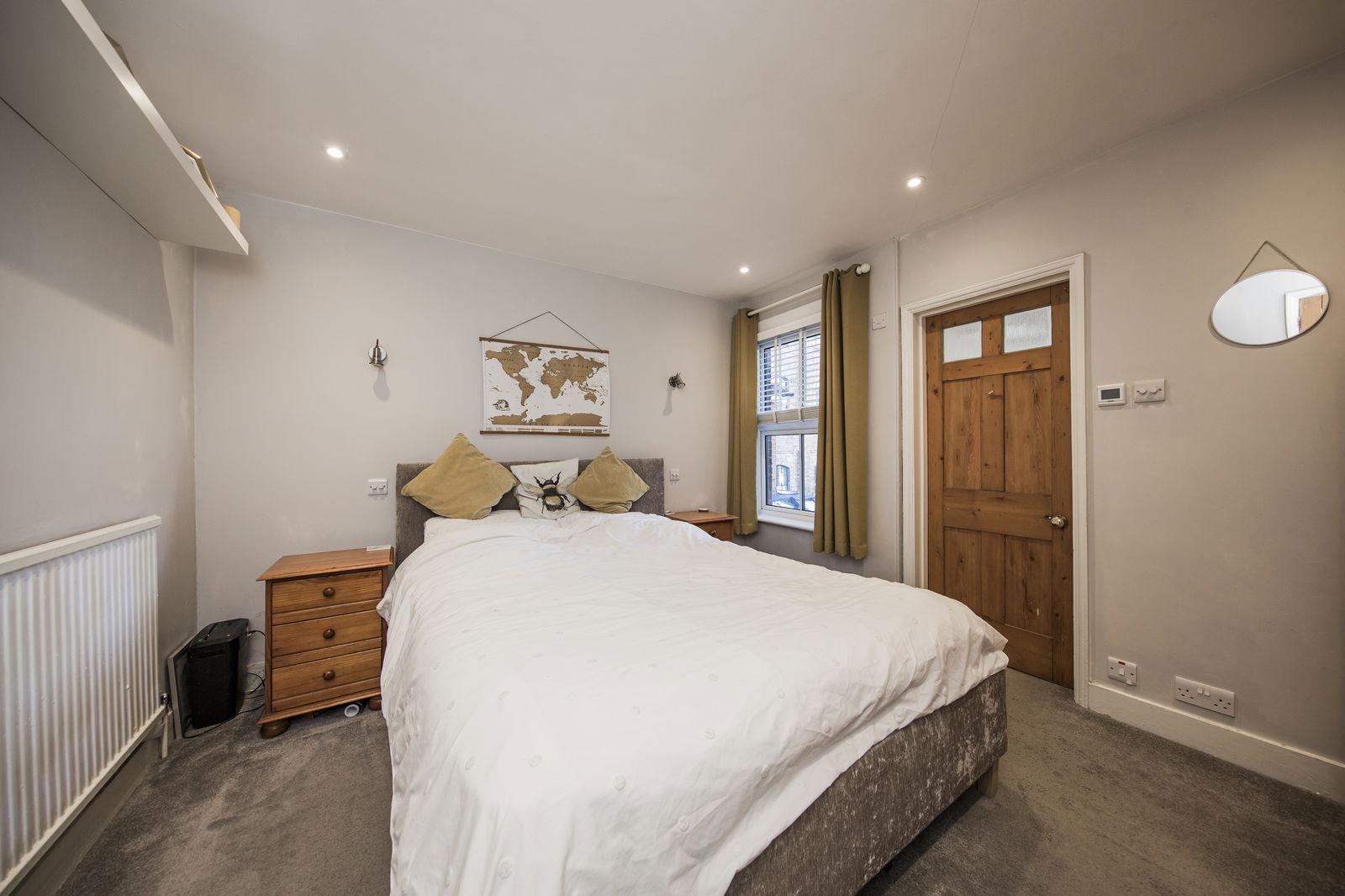 BEDROOM: A light and airy double room, tall window, period fireplace, fitted over stairs cupboard, space for bedroom furniture, wide radiator, carpeted.
