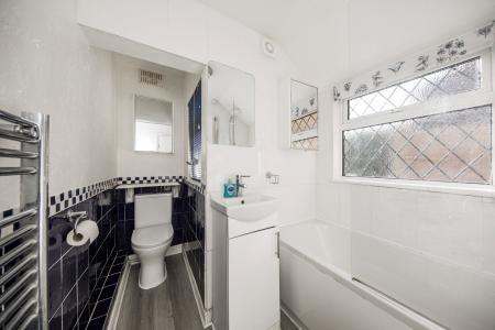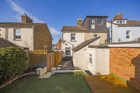 Completing the ground floor, the bathroom has a bath with shower over, WC, wash basin, chrome heated towel rail and frosted window. Stairs from the entrance hall take you to the first floor where you find the two generous sized double bedrooms. The master bedroom is at the rear of the first floor and is carpeted with a large, fitted cupboard over the stairs along with a useful fitted wardrobe within the chimney breast alcove. Bedroom two is another good-sized double with ample room for free-standing bedroom furniture. Outside there is a decorative seating area with slate chippings and areas of astro-turf lawn beyond with a decking area and useful shed. A gate at the side leads you to the driveway which is shared with the neighbouring property.