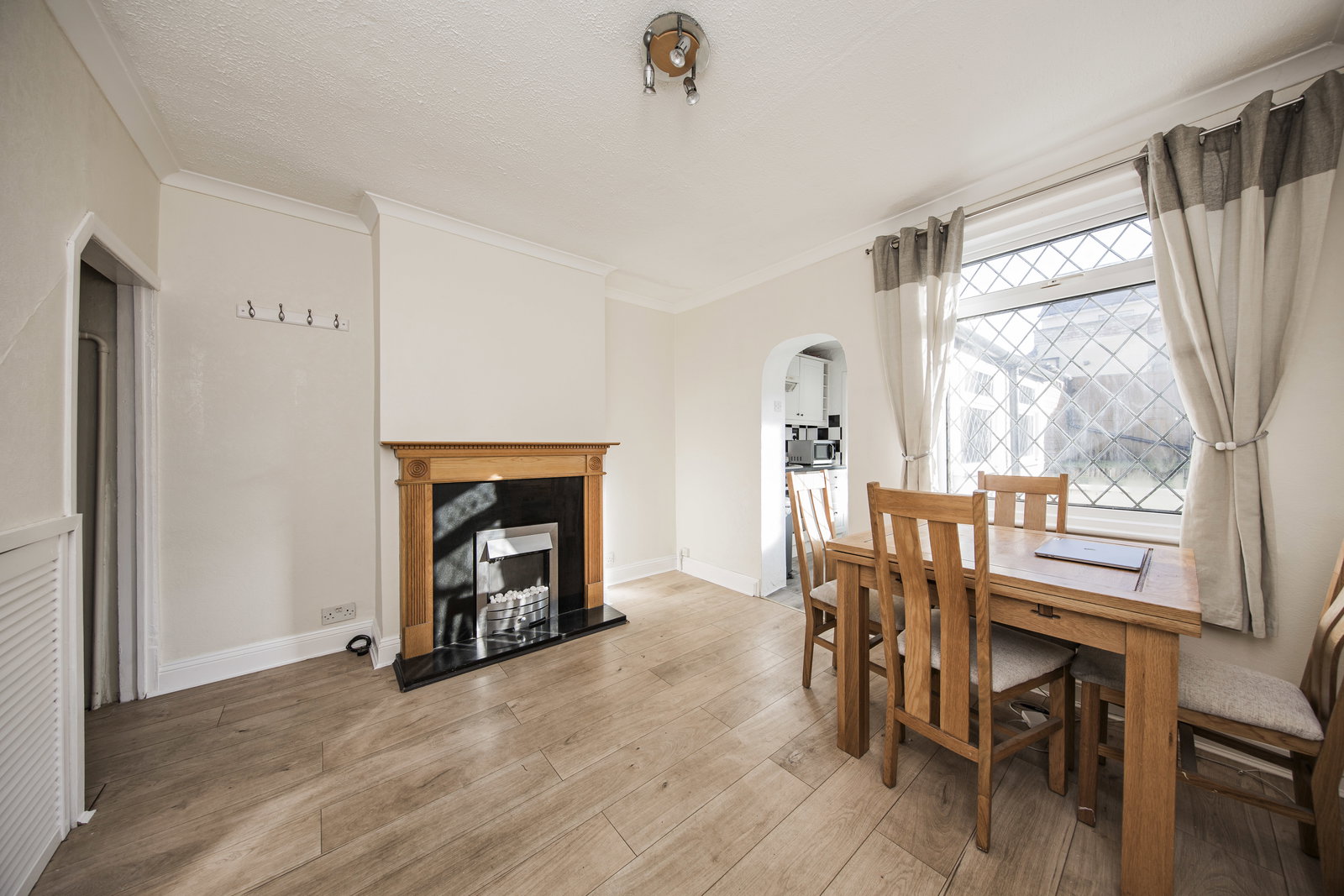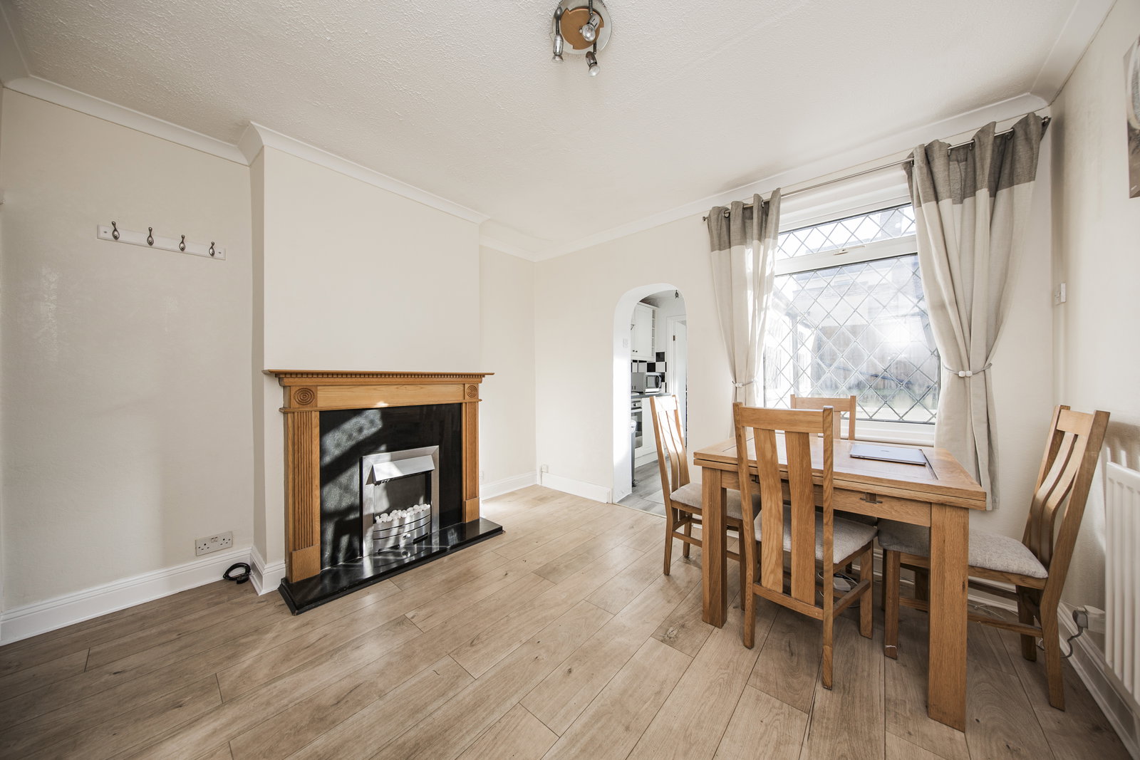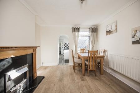 The dining room links to the kitchen effortlessly and is a generous space with room for a good-sized table and chairs. It has attractive wood effect flooring, an electric fireplace and useful storage beneath the stairs. A tall window looks onto the rear garden. The kitchen has a side window along with a door to the garden and includes a fitted electric fan oven, four-ring gas hob and space for a washing machine. There is storage available with both high and low cabinets along with marble effect work tops.