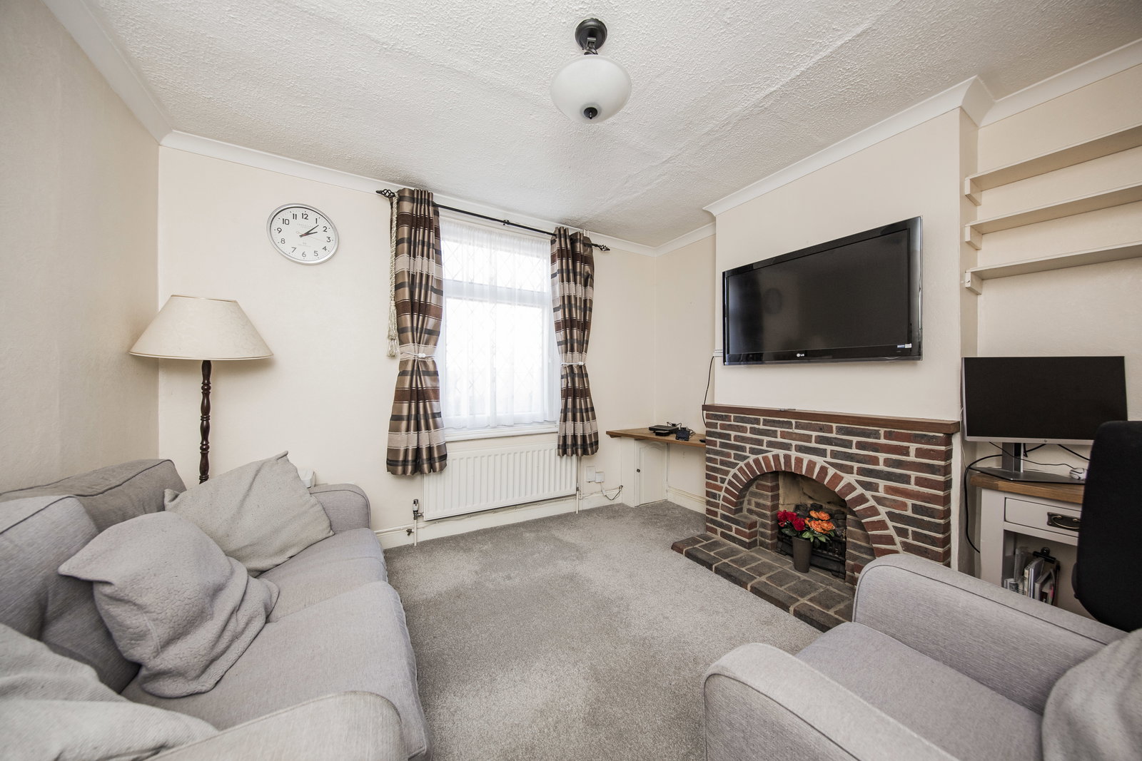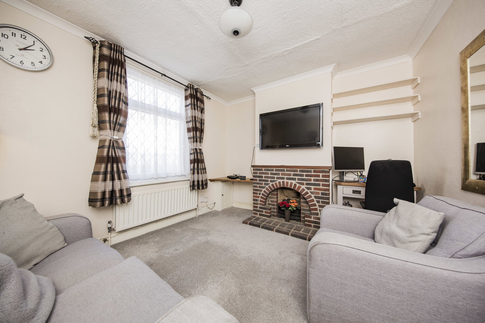 Stepping into the entrance hall the living room is on your left, with a tall, glazed window, neutral-coloured carpets and attractive gas fire with brick surround.