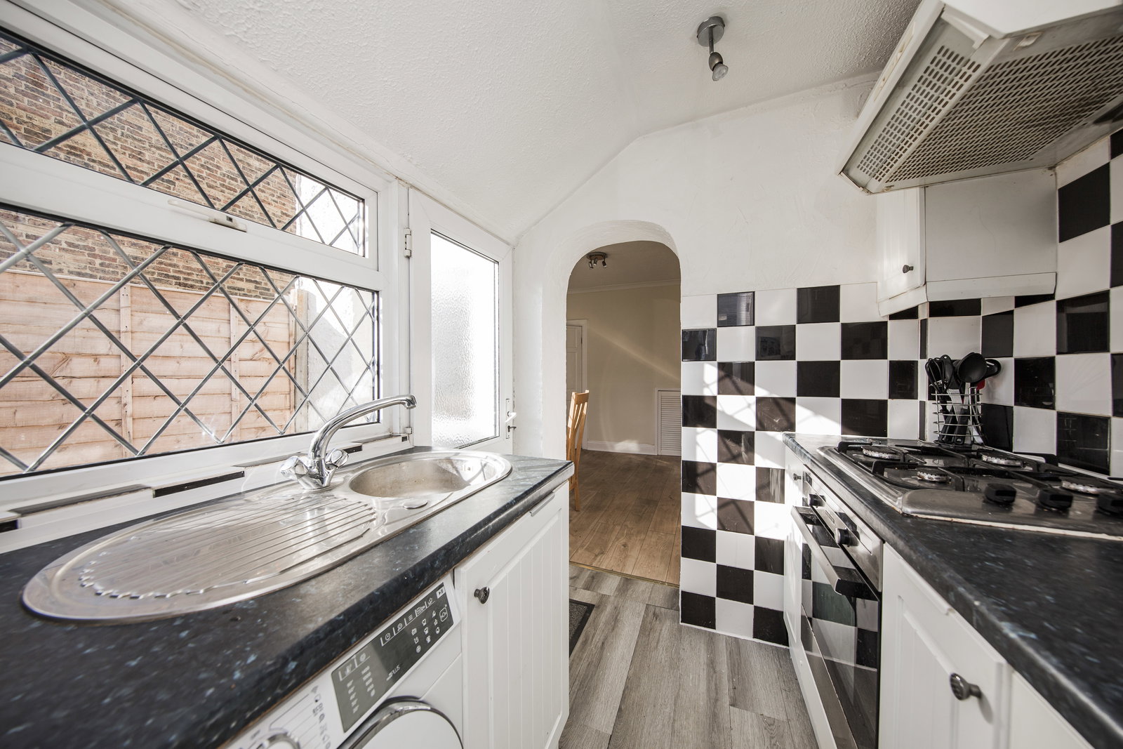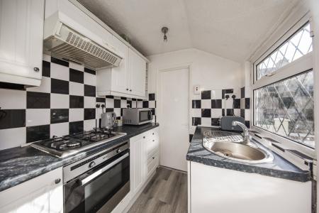 Laminate flooring, part frosted glazed door to garden, window at side, sink and drainer, fitted fan oven, four ring gas hob, extractor over, wall and floor cabinets, marble effect work surfaces, space for washing machine.