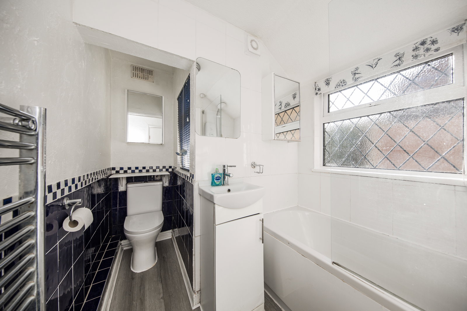 Two frosted windows, bath with electric shower over, wash basin with storage beneath, laminate flooring, chrome heated towel rail, WC, part tiled walls, extractor fan.