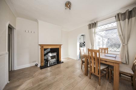 Spacious, wood effect flooring, window to garden, radiator, electric fire with granite and wood surround, large open space beneath stairs, power for tall fridge/freezer.