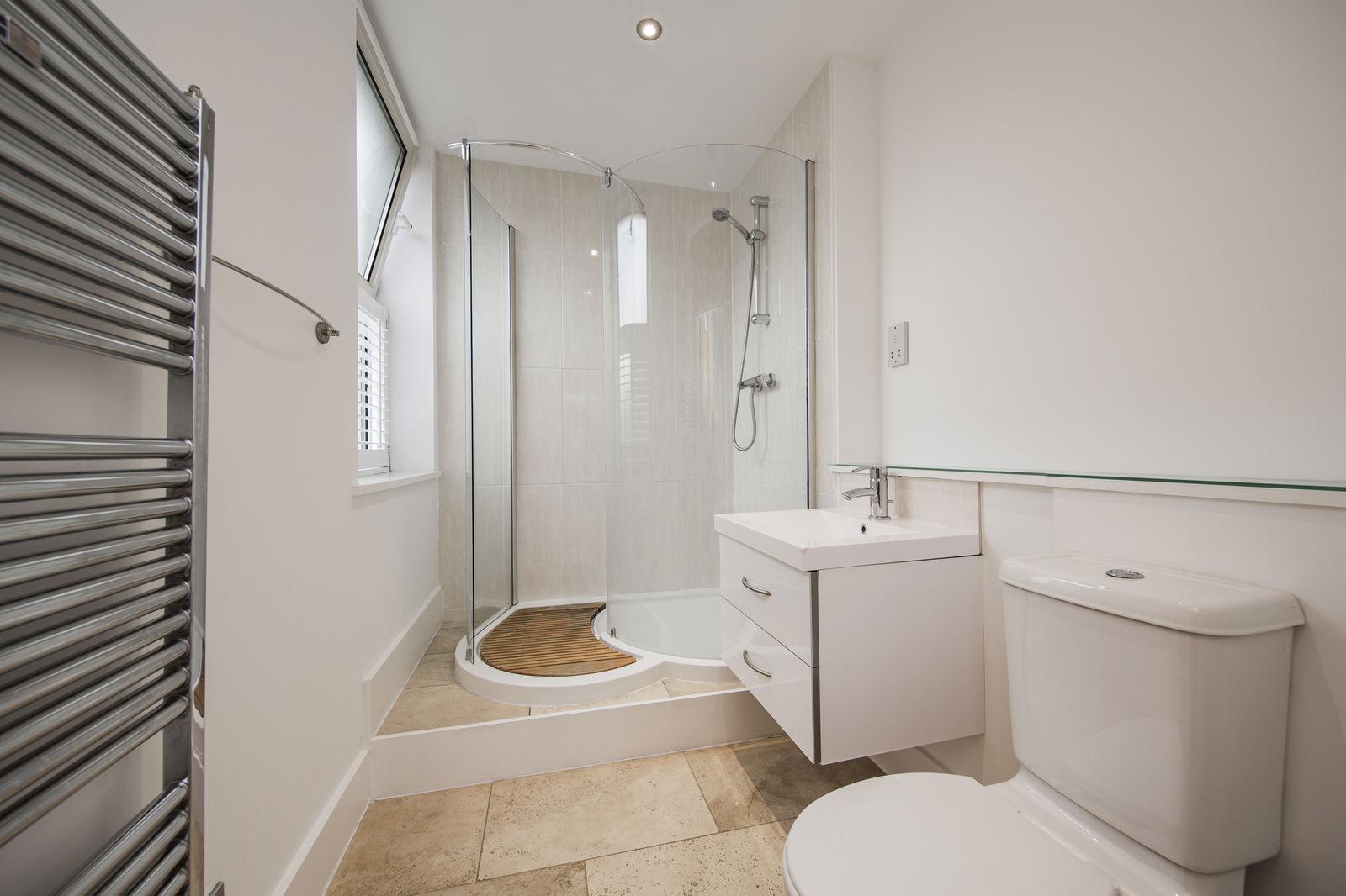 EN-SUITE: A large walk-in shower with curved glass screen, plumbed in shower, floating wall mounted wash hand basin with drawers beneath and mixer tap. Tiled floor, chrome towel rail/radiator, shaver point, ceiling downlights, extractor fan. Side window with cafe style shutters.