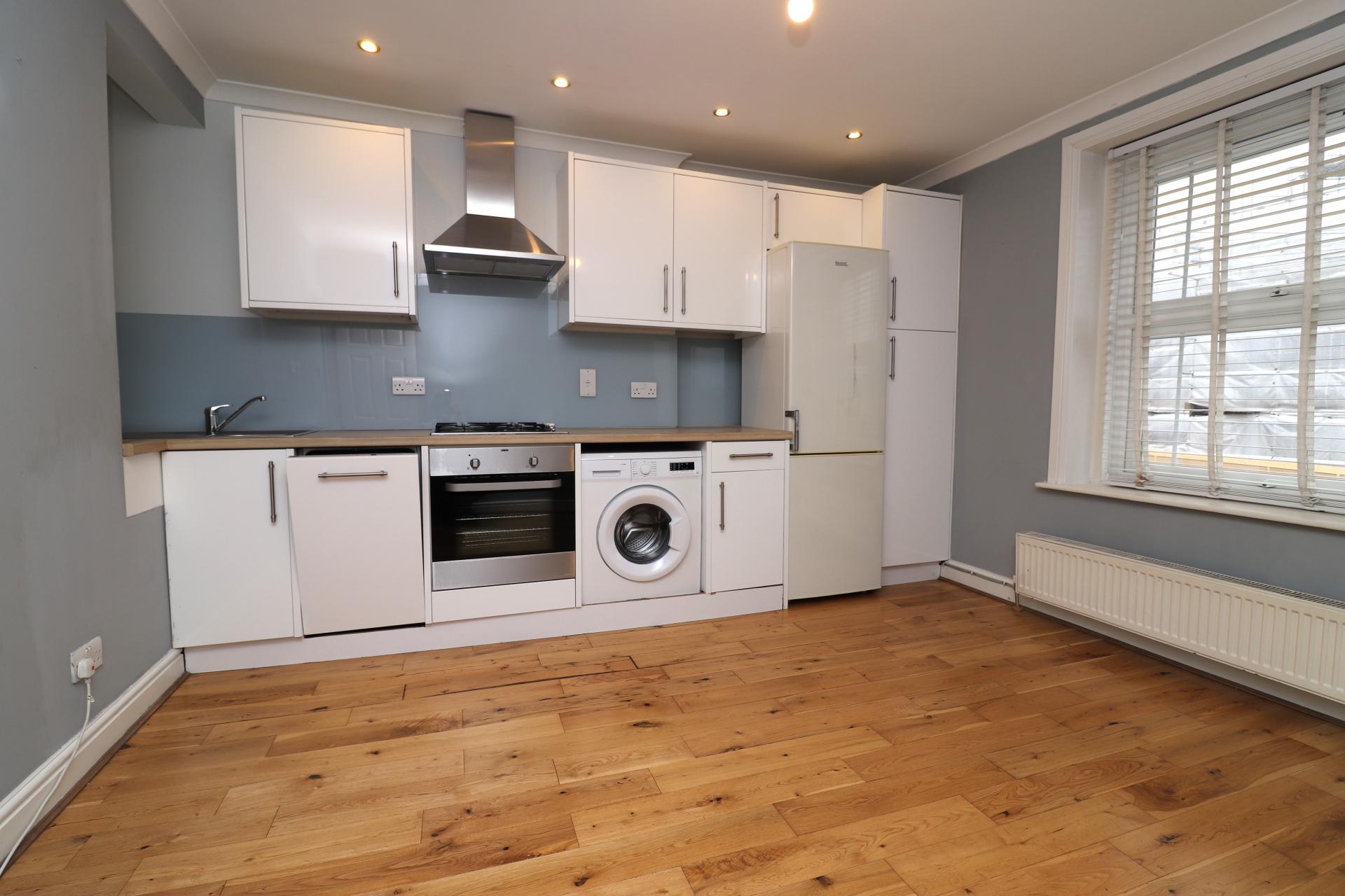 OPEN PLAN LOUNGE/KITCHEN/DINING: A range of contemporary wall and base units with a complementary work surface. Inset single bowl sink with mixer tap over. Integrated dishwasher, integrated 'Zanussi' oven and inset four ring gas hob with feature splashback and extractor hood over. Space for washing machine and space for free standing fridge/freezer. Engineered wooden flooring, ample ample space for additional furniture or table and chairs as is appropriate, cornicing, radiator, inset spotlights to the ceiling, various media points. Cupboard housing a wall mounted 'Ideal' boiler. Double glazed window to the front with fitted blind.