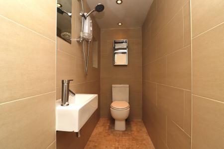 WET ROOM: Wall mounted wash hand basin with mixer tap over, wall mounted mirror, wall mounted electric shower with single shower head, low level WC. Tiled floor and walls, further open fronted medicine cabinet, inset spotlights to the ceiling, extractor fan. Opaque double glazed window to the side.