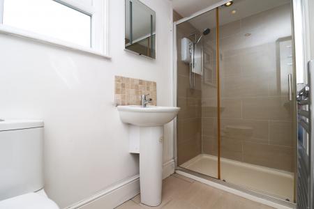 EN-SUITE SHOWER ROOM: Low level WC, pedestal wash hand basin with mixer tap over and tiled splashback, backlit wall mounted mirror, walk in shower cubicle with sliding doors and single head electric shower over. Opaque window returning to landing area, tiled floor, inset spotlights to the ceiling, heated towel radiator, extractor fan. Opaque double glazed window to the rear.