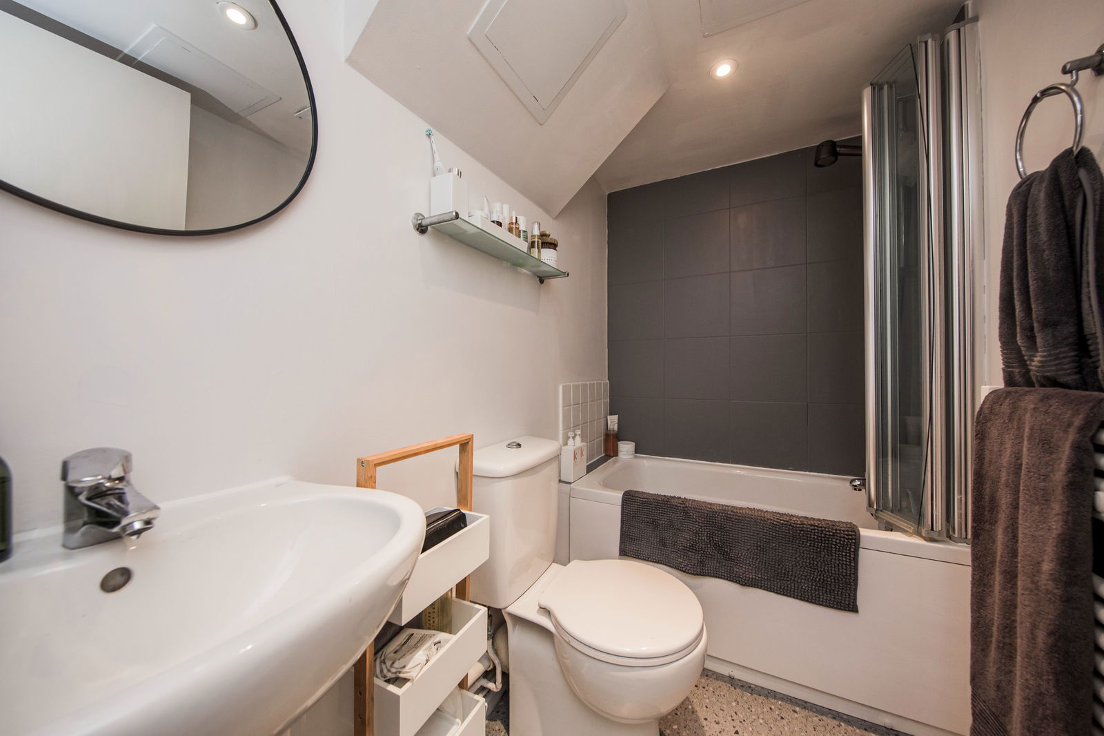 EN-SUITE BATHROOM: White suite comprising of a small panelled bath with plumbed in shower above, tiled shower area, low level WC, pedestal wash hand basin with mixer tap, vinyl tiled floor, radiator/towel rail.