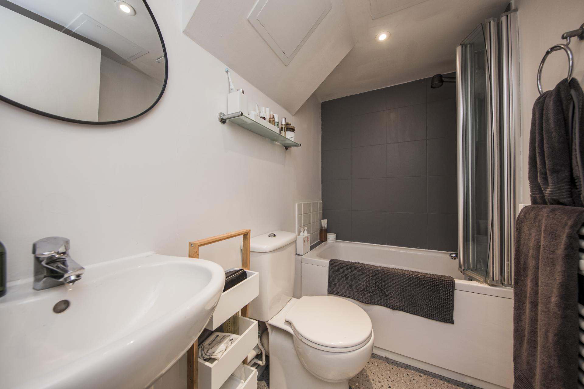EN-SUITE BATHROOM: White suite comprising of a small panelled bath with plumbed in shower above, tiled shower area, low level WC, pedestal wash hand basin with mixer tap, vinyl tiled floor, radiator/towel rail.