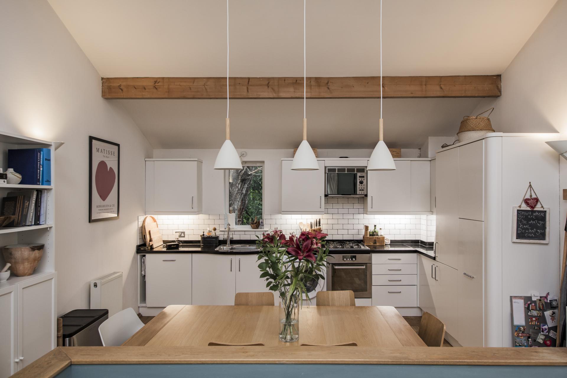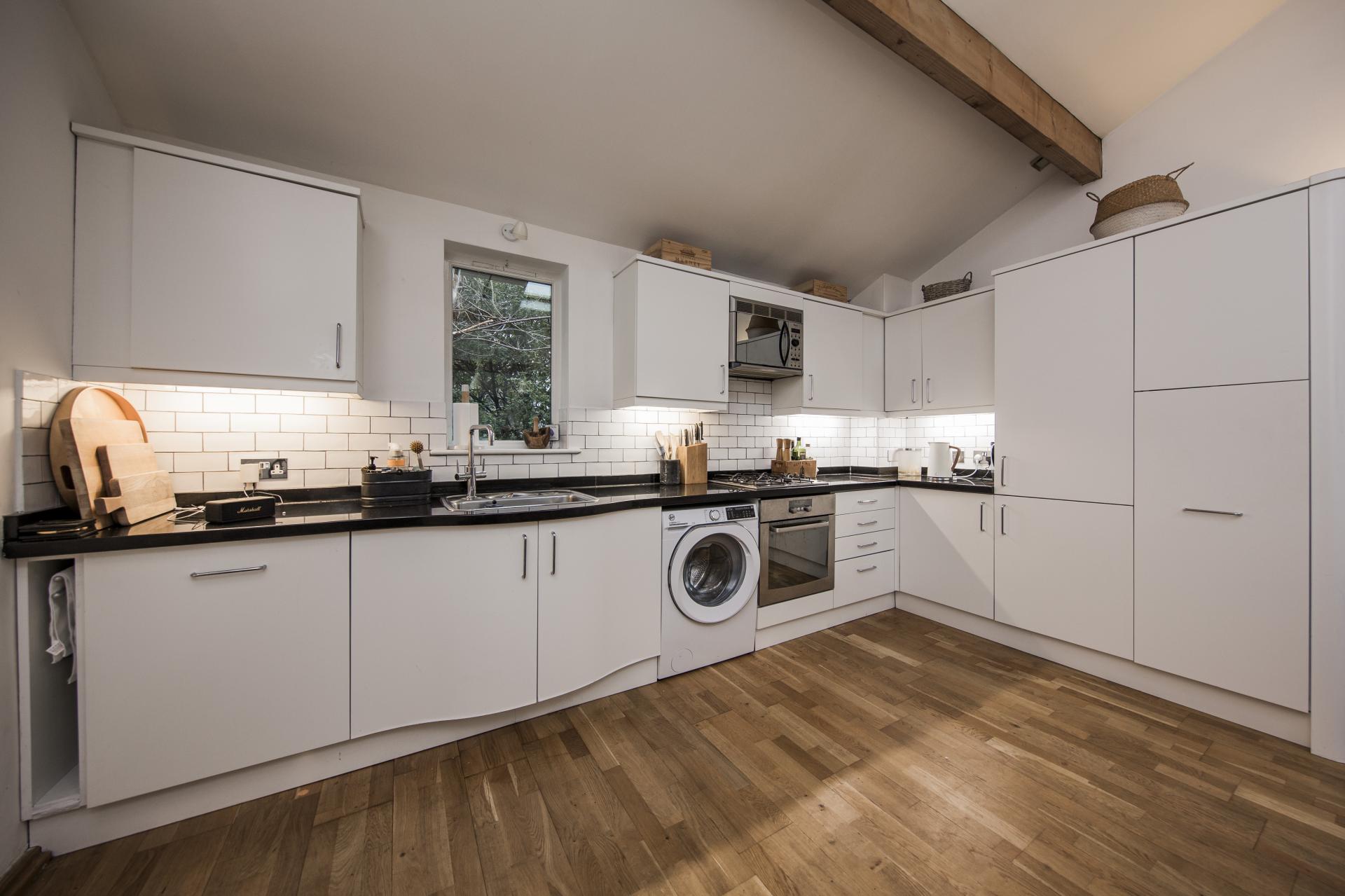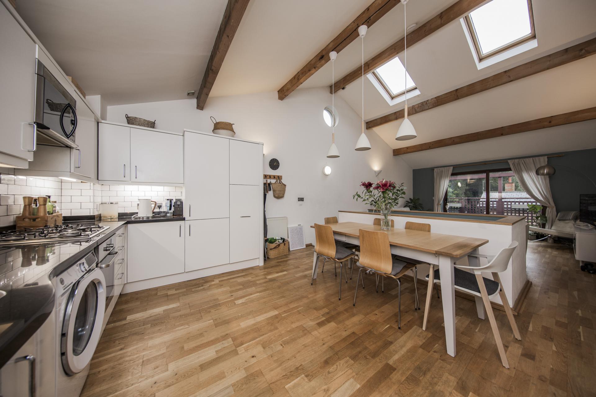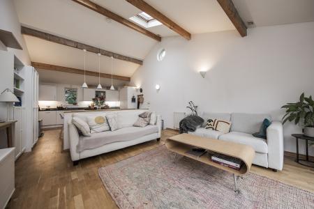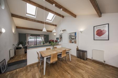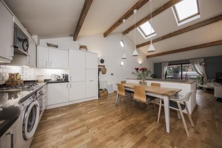 OPEN PLAN LIVING/KITCHEN/DINING AREA: This is a wonderful open plan space with high vaulted ceiling benefiting from lots of light from the Velux windows in the ceiling and the sliding doors that lead out to the terrace. The kitchen is fitted with a comprehensive range of wall and base units with stone worktops and includes a stainless steel sink unit with mixer tap, integrated dishwasher, electric oven and gas hob with microwave above, fridge/freezer, pull-out larder, space for washing machine, wood flooring and window to rear.