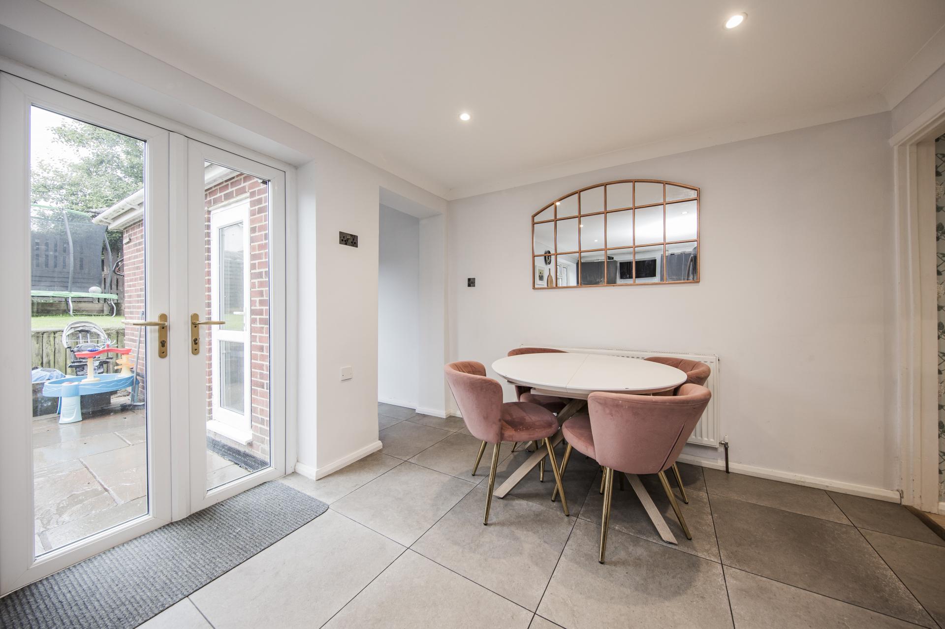 At the heart of the property lies a stunning kitchen/diner, thoughtfully designed for both everyday living and stylish entertaining. Striking dark grey cabinetry is complemented by matching work surfaces and high-end appliances, including a double oven at eye level, a five-ring gas hob with contemporary extractor, and a sleek glass splashback. An inset sink with mixer tap, integrated microwave and dishwasher, and ample space for an American-style fridge/freezer offer both convenience and design cohesion. Large double-glazed windows and French doors invite light into the space and open directly onto the rear garden, blurring the boundary between indoor and outdoor living. The tiled flooring and ceiling spotlights complete the clean, modern finish.