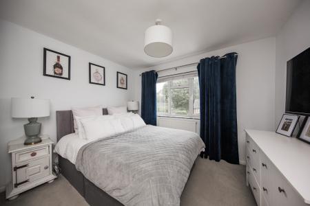 Upstairs, the first-floor landing is well-lit via recessed ceiling spotlights and includes a loft hatch with ladder and integrated lighting, offering easy access to additional storage. The principal bedroom is a serene, stylish retreat with a generous walk-in wardrobe-easily adaptable into an en-suite bathroom, subject to necessary permissions. Two further double bedrooms also enjoy front-facing double-glazed windows, each with built-in storage, making them perfect for family living or home office needs.