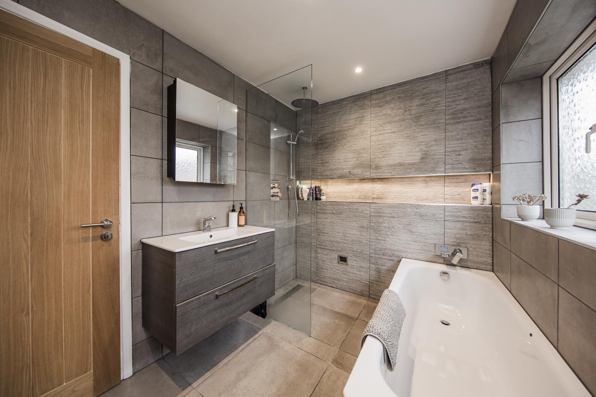 The luxurious bathroom has been finished to a high standard with a walk-in shower featuring a waterfall head and handheld attachment, a panelled bath with mixer tap, and a sleek vanity unit with integrated drawers. Elegant tiled walls and flooring, dual frosted windows, and a heated towel rail create a spa-like atmosphere.
