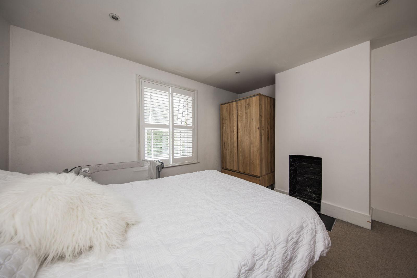 There are two double bedrooms, both stylishly finished. The principal bedroom features a front-facing double-glazed window with plantation shutters and ceiling spotlights, while the second bedroom to the rear enjoys a peaceful garden view and benefits from an airing cupboard housing the combi boiler.