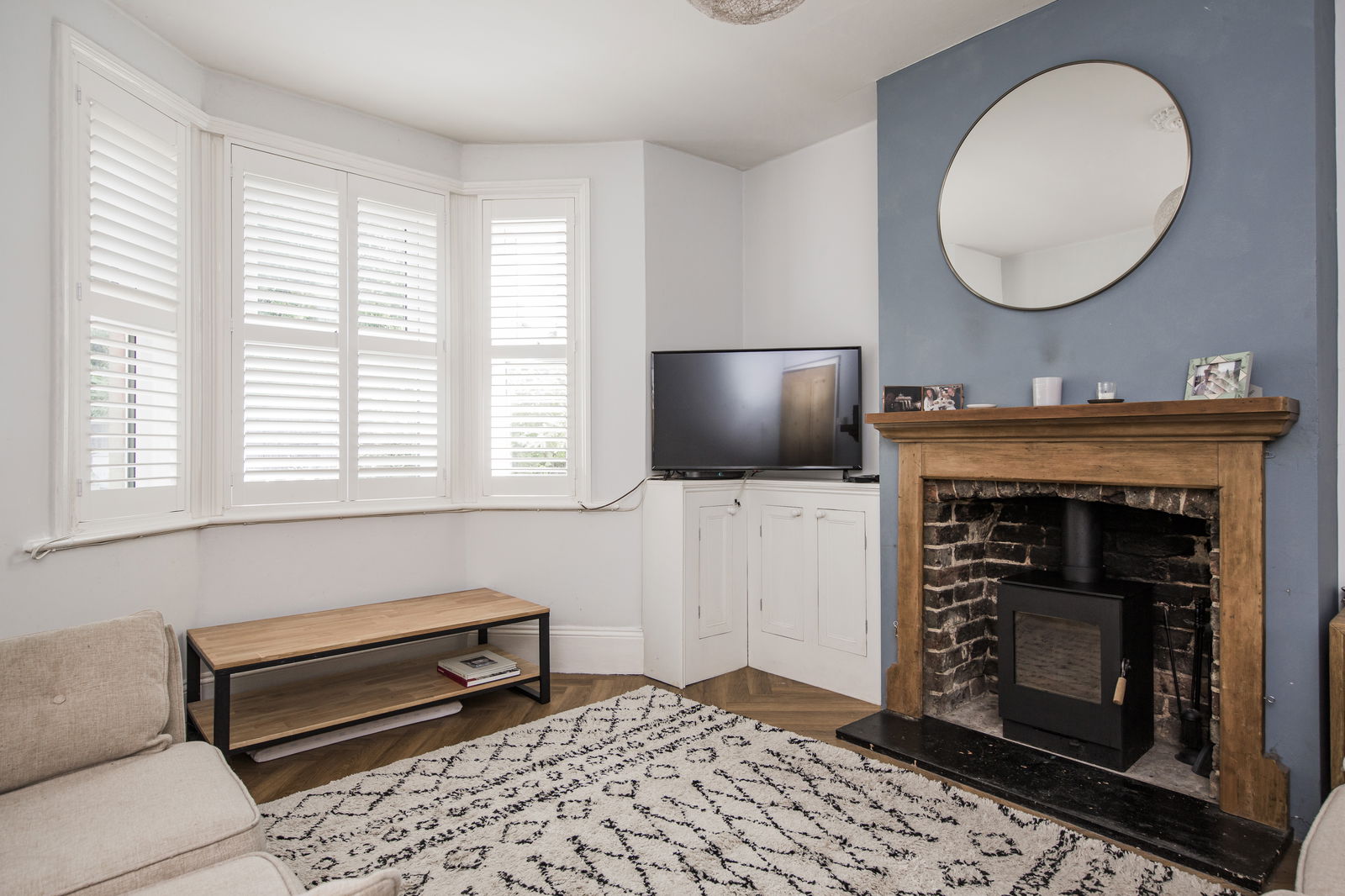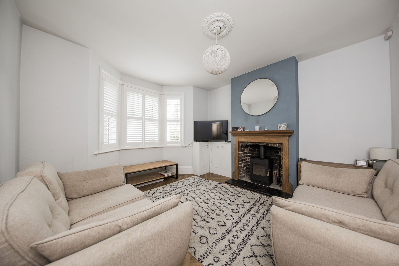 To the front of the home, the lounge is a serene retreat, featuring a striking double-glazed bay window with bespoke plantation shutters. A log burner, set on a stone hearth with a classic wooden surround, provides a stylish focal point, complemented by the continuation of herringbone flooring and a traditional radiator.