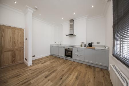 KITCHEN/DINING ROOM: Recently installed modern kitchen with stylish base and drawer units and complementary quartz worktop and upstand. Inset sink and mixer tap. 'Neff' built-in oven with slide and hide drop down door, electric hob and cooker hood over. 'Bosch' built-in washing machine and 'Bosch' slimline dishwasher. Wooden flooring throughout, electric ceramic radiator, downlights. Sash window to front.