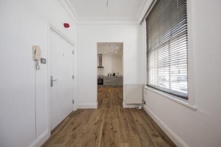 HALLWAY: A good sized entrance hallway with sash window to front, wooden flooring, wall mounted intercom system.