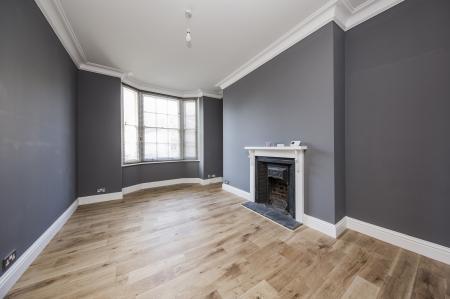 SITTING ROOM: A generous sitting room with a bay window to the front, electric ceramic radiator, feature fireplace including cast iron inset, wooden flooring, high ceilings and decorative cornice.