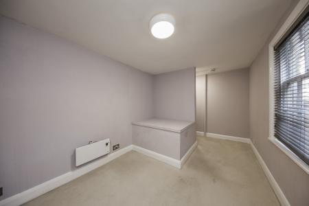 A double bedroom, built-in shelving, wall mounted electric heater, carpet. Sash window to rear.