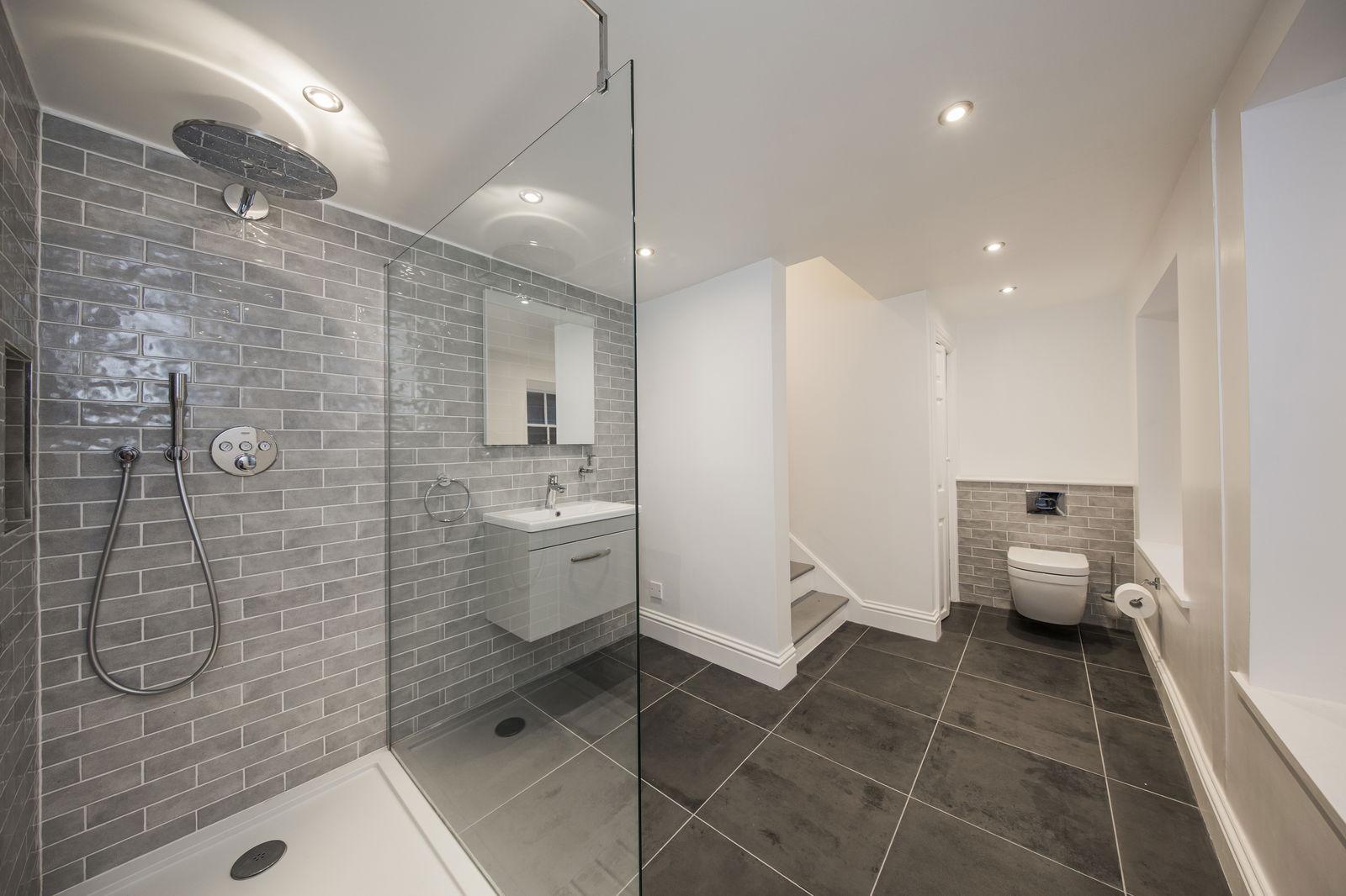 SHOWER ROOM: Recently installed featuring a large walk-in shower with hand held shower attachment and drench head, wall mounted wash hand basin with cupboard underneath and mirror above, low level concealed cistern WC. Built-in store cupboard housing pre lagged hot water tank and electric consumer unit. Tiled flooring, stylish grey metro wall tiling, downlights, underfloor heating. Two sash windows to rear.