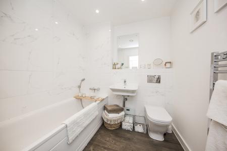 BATHROOM: Fitted with a suite comprising of low level wc, wash hand basin, panel enclosed bath with mixer tap and shower attachment. Laminate flooring, part tiled walls, wall mounted ladder style heated towel rail, wall mounted mirror.