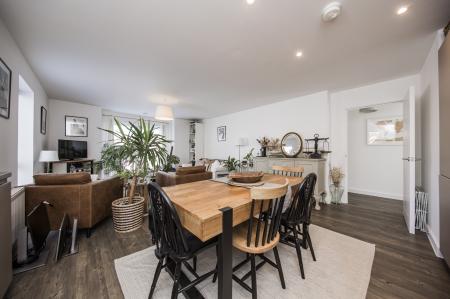 OPEN PLAN LIVING ROOM/KITCHEN/DINER: Laminate flooring, two radiators. Two double glazed windows to the front and one double glazed window to the side.