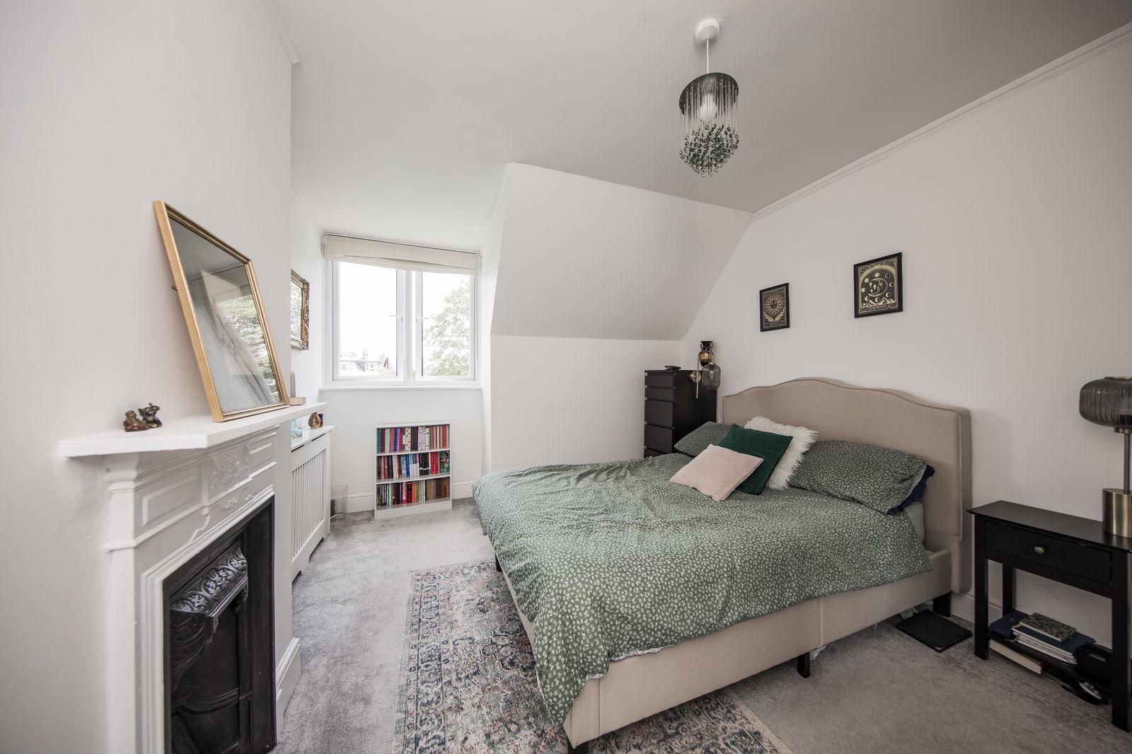 BEDROOM: Carpeted, radiator inset to a decorative cover, areas of sloping ceiling, loft access hatch, areas of cornicing. Feature cast iron fireplace with cast iron surround. Space for a double bed and associated bedroom furniture. Window to the rear.