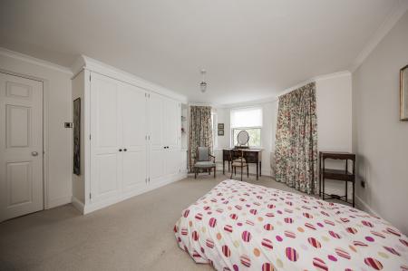 MASTER BEDROOM: A generous double bedroom with attractive built-in wardrobes with cupboards and shelving above, double glazed bay window to side, radiator, carpet.