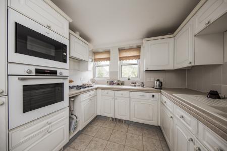 KITCHEN: Fitted with a range of wall, base and drawer units with complementary worktop. Built-in oven and microwave, inset gas hob with extractor fan over. One and a half bowl sink and drainer with mixer tap. Space for washing machine, built-in fridge/freezer, part tiling to walls, built-in wall mounted gas central heating boiler, vinyl flooring. Two double glazed windows to side.