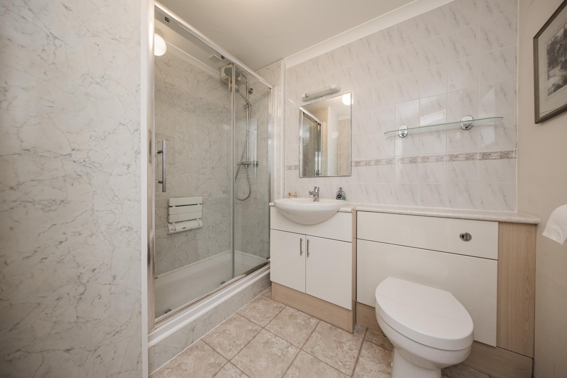 SHOWER ROOM: A good sized double shower cubicle, low level WC, wash hand basin with cupboard underneath, tiling to walls and flooring, extractor fan, heated towel rail.
