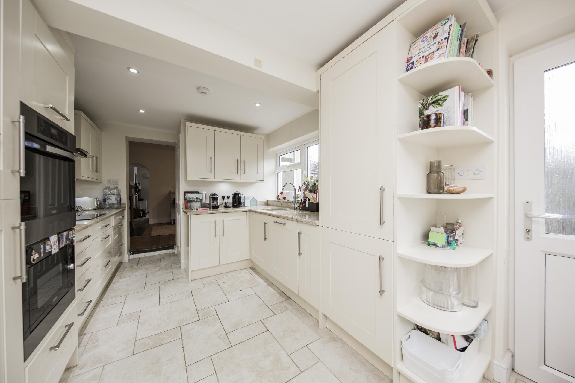 KITCHEN/DINING ROOM: Ample floor and wall cabinets, plenty of worksurfaces, tiled flooring, fitted fridge/freezer, fitted dishwasher, fitted fan oven, fitted microwave, four ring induction hob with extractor, one and a half sink and drainer, separate fitted washing machine and tumble dryer, space for good sized table and chairs, door to side, bi-fold doors to garden.