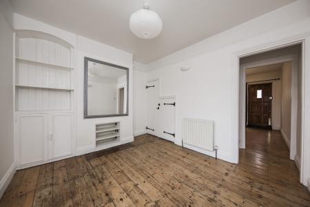 SITTING ROOM: A good sized sitting room with double glazed window to front with shutters, feature fireplace with brick hearth. Built in cupboard to side with shelving above, picture rail, radiator, exposed wooden floorboards.