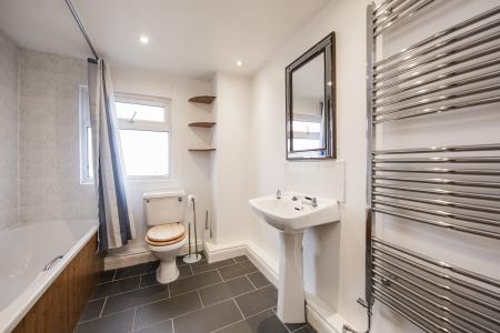 BATHROOM: A good size bathroom with panelled bath with mixer tap and shower attachment, low level WC, pedestal wash hand basin, heated towel rail, tiled flooring, part tiling to walls. Double store cupboard housing wall mounted gas central heating boiler, plumbing for washing machine, downlights, laminate flooring.