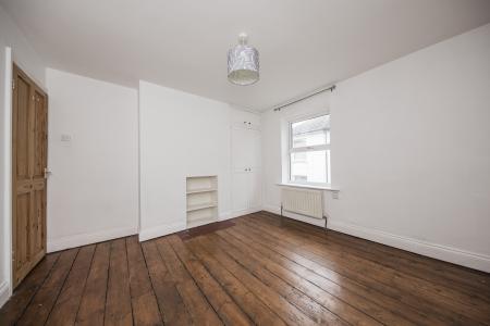 BEDROOM 1: Double glazed window to front, built-in wardrobe, exposed wooden floorboards, radiator.