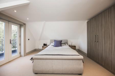 PRINCIPAL BEDROOM: Radiator, power points, TV point. Range of built-in wardrobes. Double glazed french doors opening onto a Balcony with rear views towards the communal garden, wrought iron balustrade.