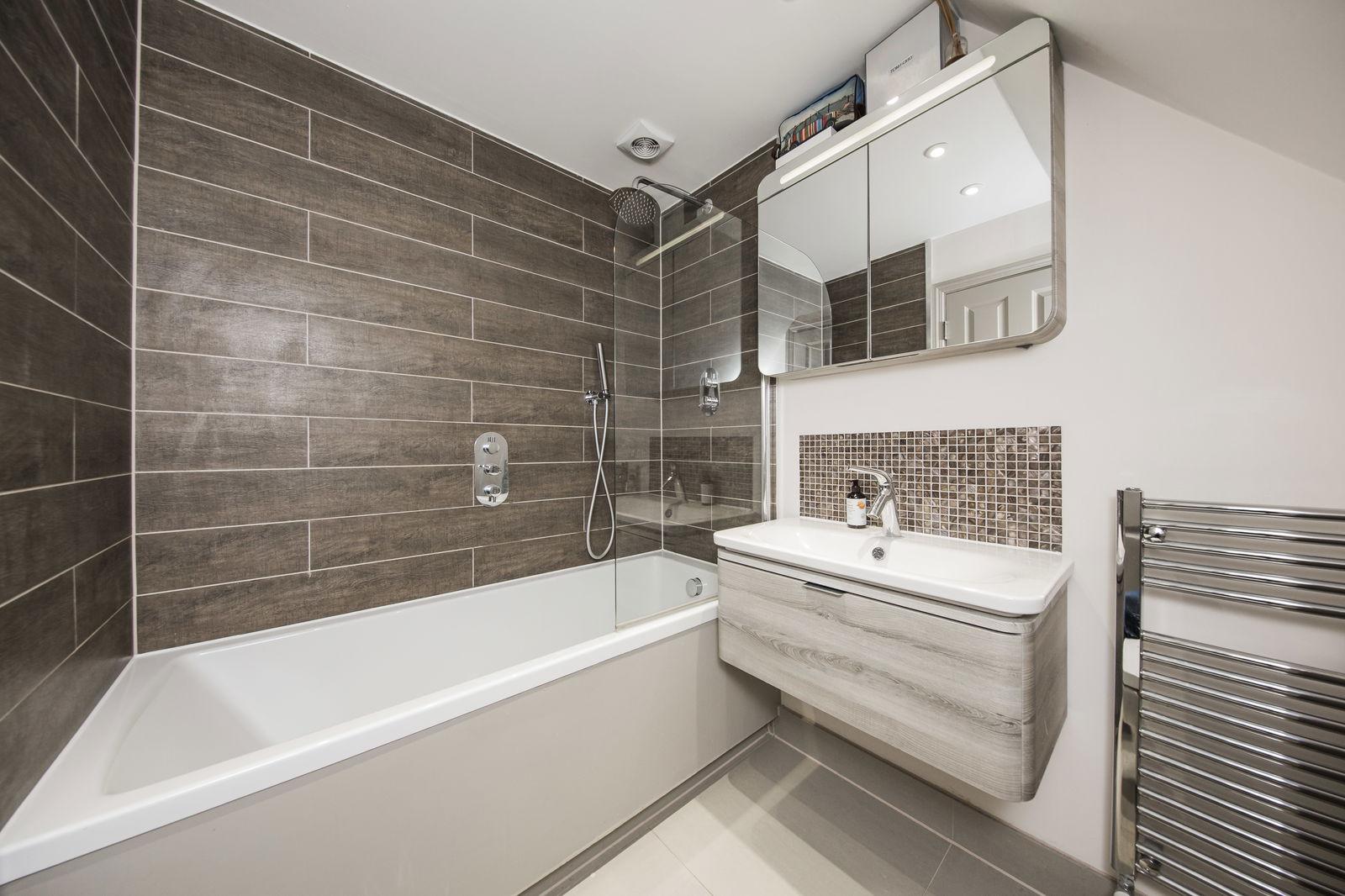 EN-SUITE BATHROOM: White suite comprising of a panelled bath with hand shower spray and rainfall shower over, glazed shower screen, floating wall mounted wash hand basin with mixer tap, low level WC. Tiled floor with underfloor heating, chrome towel rail/radiator, extractor fan.