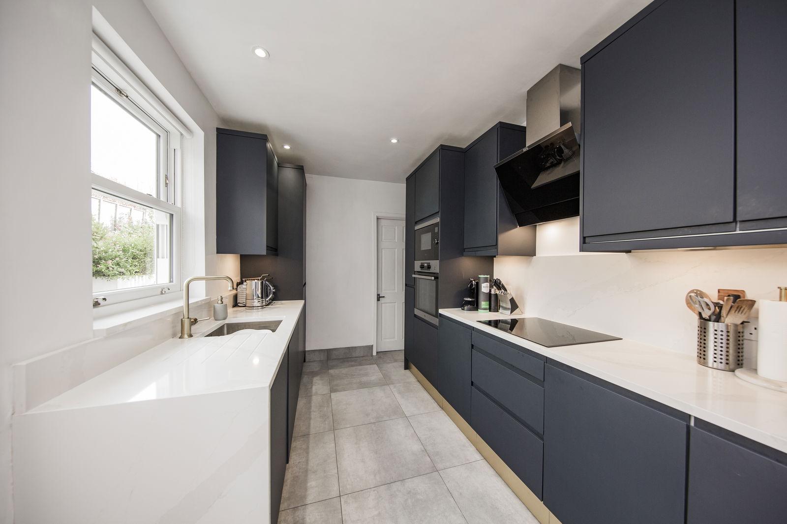 KITCHEN: Fitted with a modern range of wall base and drawer units with complementary marble worktops and end panel. Fully integrated 'AEG' appliances including a fridge/freezer, oven, microwave, dishwasher, washing machine and extractor fan. Inset sink with mixer tap. Tiled flooring, down lights, contemporary radiator . Double glazed sash window and part glazed door to the side.