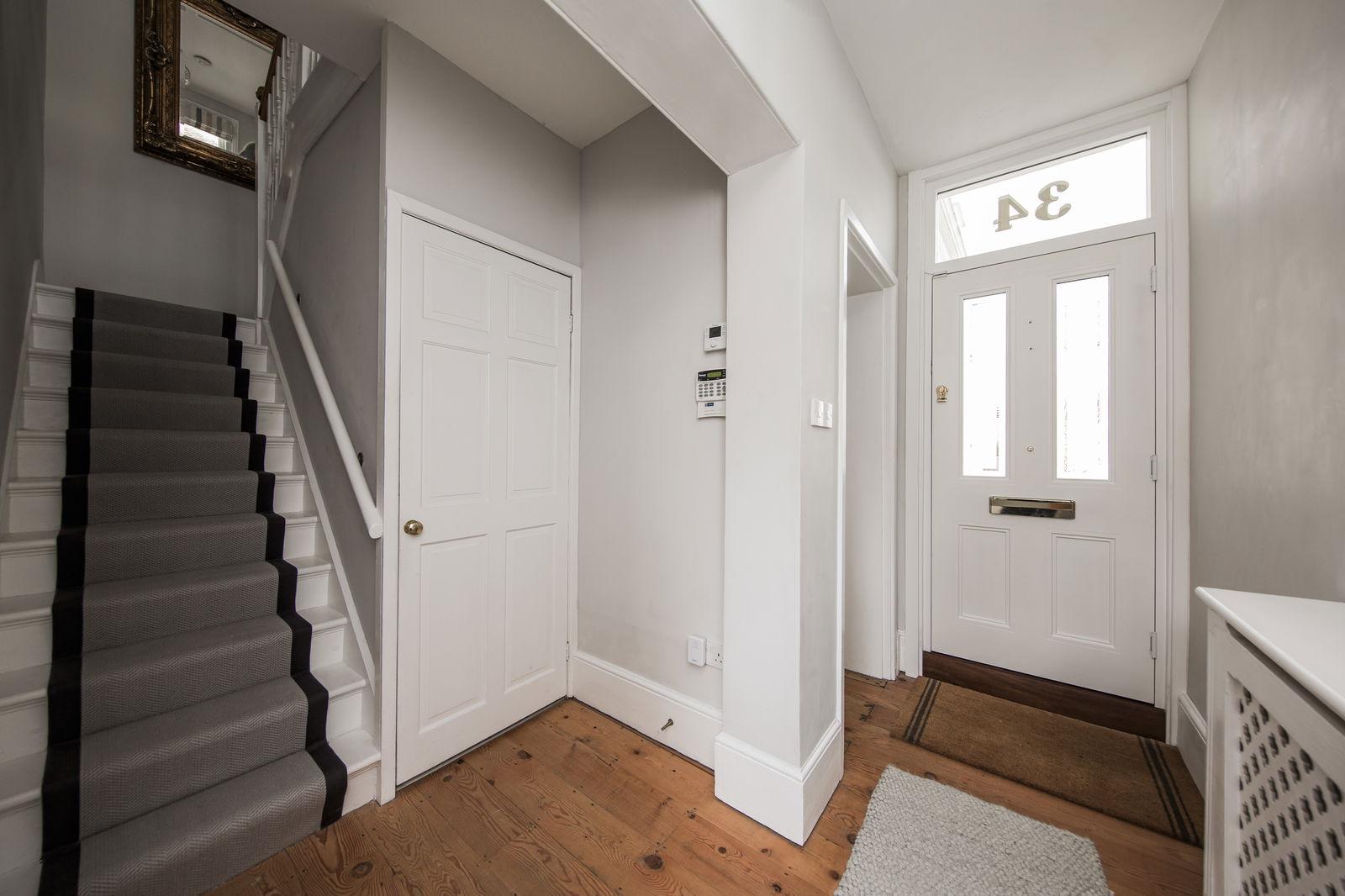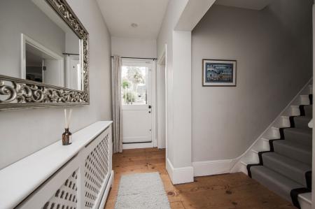 HALLWAY: A bright and spacious hallway with a part glazed door leading to the rear garden, a large understairs store cupboard, exposed floorboards, radiator with decorative cover.