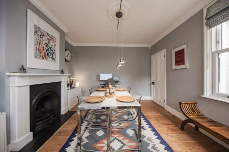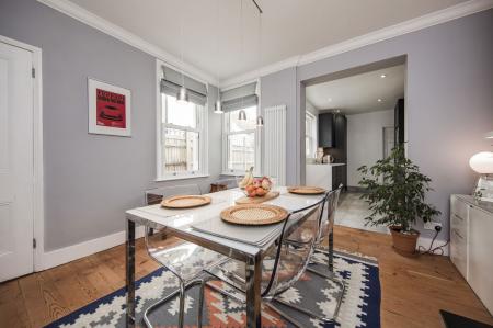 DINING ROOM: Opening into the kitchen. The dining area enjoys a dual aspect with double glazed windows to side and rear. Feature fireplace with cast iron inset, exposed floorboards, contemporary radiator.