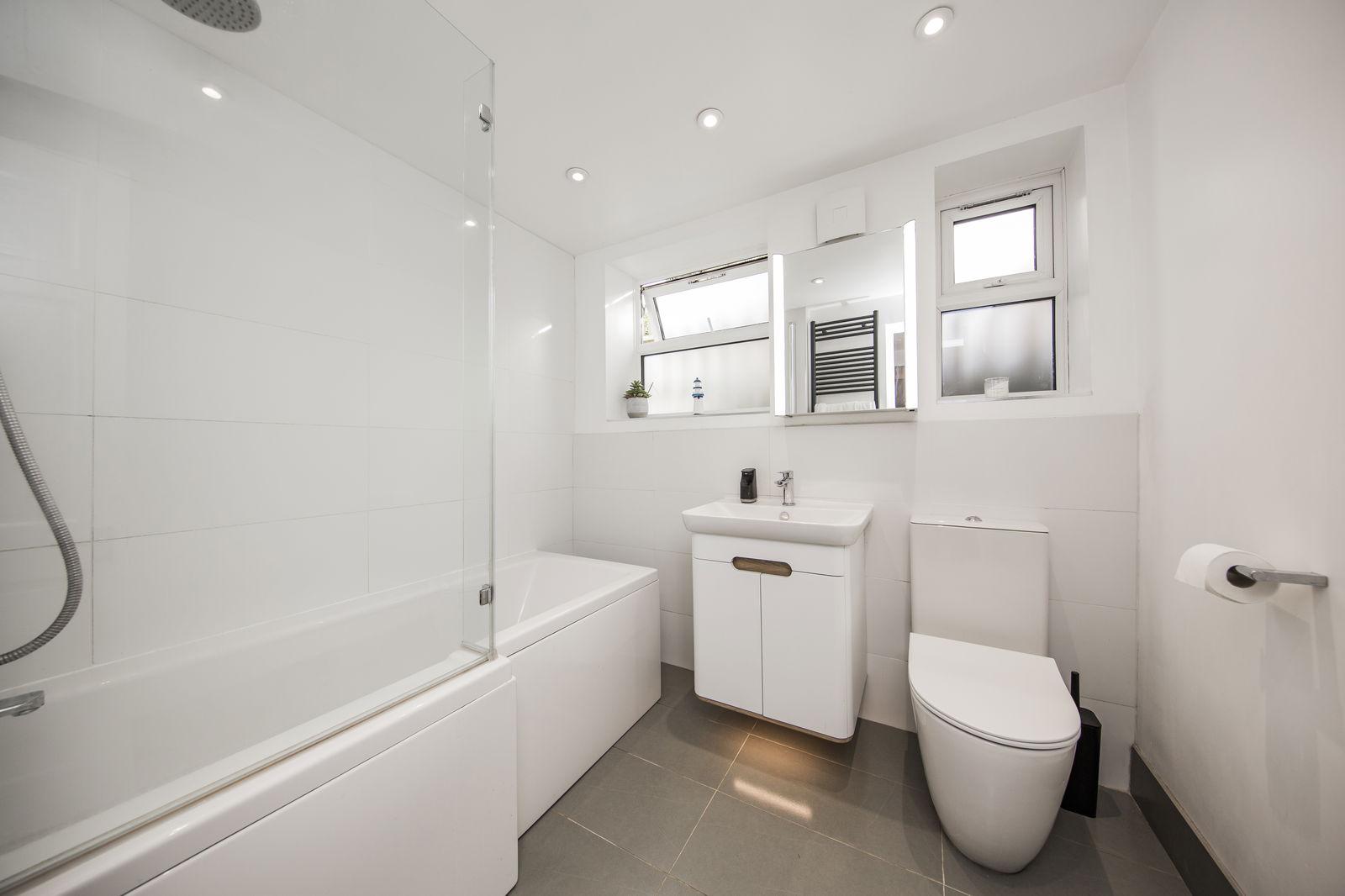 BATHROOM: A modern suite comprising a 'P' shaped bath with mixer tap, drench head shower, and handheld shower attachment, low level WC, wash hand basin with cupboard underneath. Heated towel rail, tiled flooring, down lights, extractor fan. Two double glazed windows to rear.