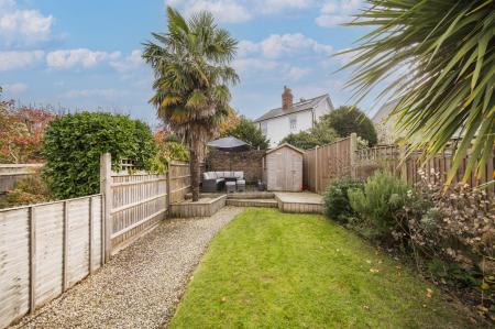 OUTSIDE REAR: A good sized garden with fencing and walling to boundaries, steps up to raised lawn area and further decked patio, shrubs to borders, stone pathway, wooden shed.