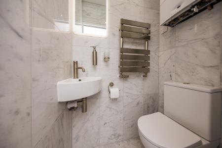 EN-SUITE CLOAKROOM: A superbly finished cloakroom with low level WC, corner wash hand basin with mixer tap, marble flooring and wall tiling, wall mounted gas central heating boiler installed in 2024, heated towel rail.